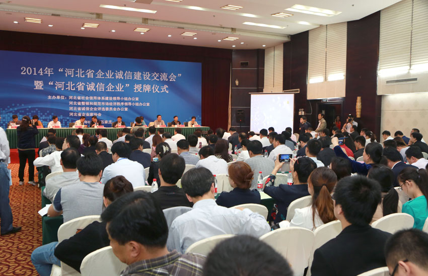 2014年9月26日,由河北省社會信用體系建設(shè)領(lǐng)導(dǎo)小組辦公室、河北省整頓和規(guī)范市場經(jīng)濟(jì)秩序領(lǐng)導(dǎo)小組辦公室、河北省誠信企業(yè)評選委員會辦公室、河北省企業(yè)家協(xié)會主辦并組織的“河北省企業(yè)誠信建設(shè)交流會”暨“河北省誠信企業(yè)”授牌儀式在石家莊市凱旋金悅大酒店隆重舉行。出席此次會議的領(lǐng)導(dǎo)有:原河北省委書記葉連松、河北省委宣傳部部務(wù)會成員、省文明辦專職副主任李社軍、河北省地方稅務(wù)局副局長王文濤、河北省企業(yè)家協(xié)會名譽(yù)會長王永忠、河北省工經(jīng)聯(lián)(經(jīng)團(tuán)聯(lián))副會長兼秘書長陳建民、河北省消費(fèi)者協(xié)會會長張福齊、河北省企業(yè)家協(xié)會副會長兼秘書長劉建軍以及河北省國稅局、河北省環(huán)保廳、人行石家莊中心支行、河北省質(zhì)監(jiān)局、河北省整規(guī)辦等單位領(lǐng)導(dǎo)。出席此次會議的還有部分省直相關(guān)單位負(fù)責(zé)人、省級行業(yè)協(xié)會負(fù)責(zé)人、地市(縣)工經(jīng)聯(lián)、企業(yè)家協(xié)會負(fù)責(zé)人以及當(dāng)選2014年“河北省誠信企業(yè)”的企業(yè)代表近四百人。