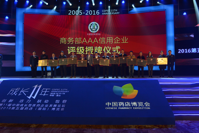 2016年12月12日,第十一屆中國成長型醫(yī)藥企業(yè)發(fā)展論壇暨2016第五屆藥店國際博覽會在江蘇省蘇州昆山市開幕。會議期間隆重舉辦商務(wù)部AAA信用企業(yè)評級授牌儀式,神威藥業(yè)繼2011年后再度榮獲商務(wù)部AAA信用企業(yè)評級。