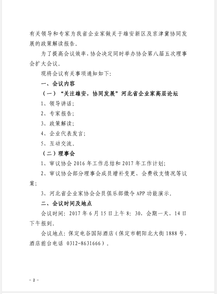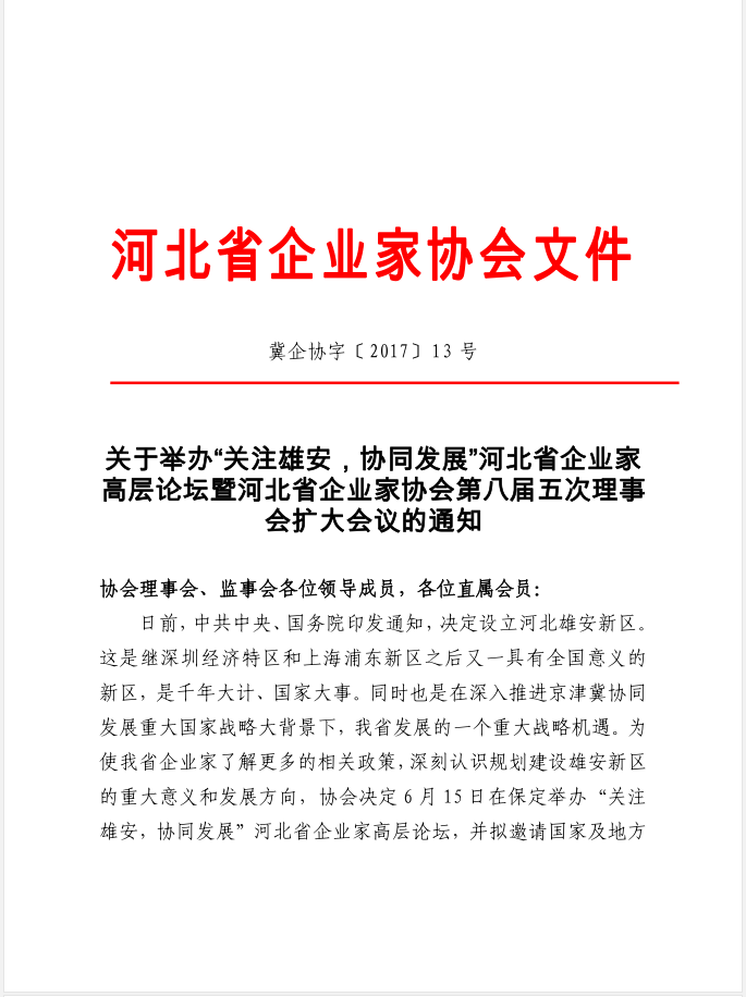 關(guān)于舉辦“關(guān)注雄安,協(xié)同發(fā)展”河北省企業(yè)家高層論壇暨河北省企業(yè)家協(xié)會第八屆五次理事會擴大會議的通知
