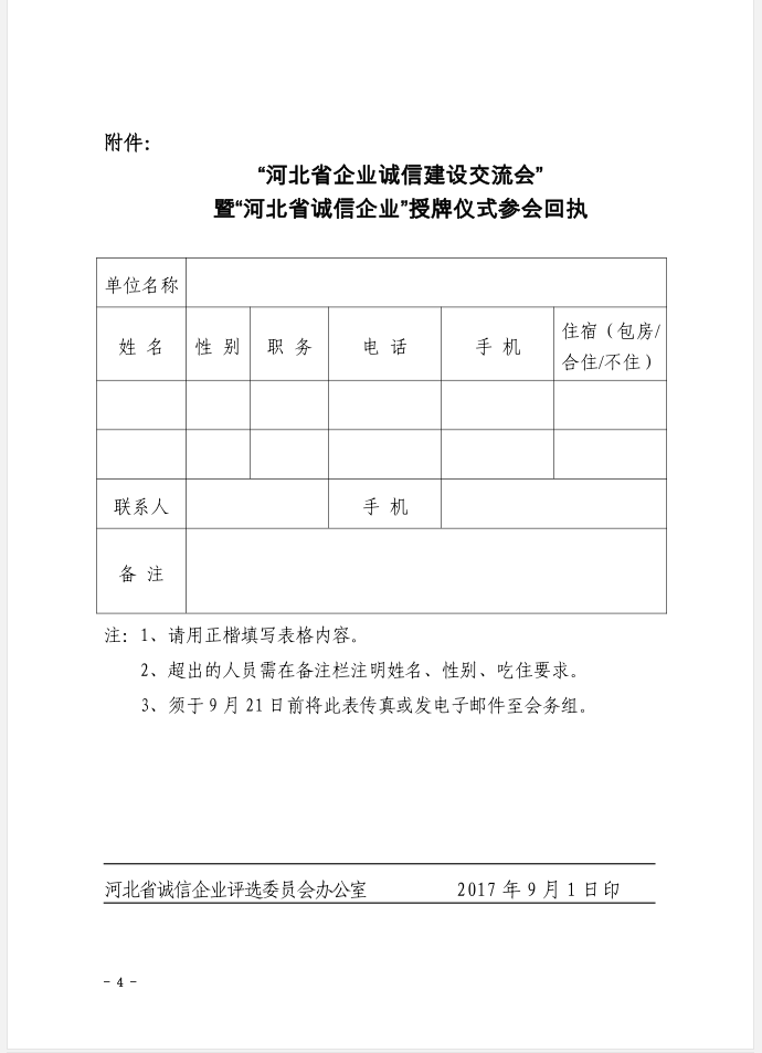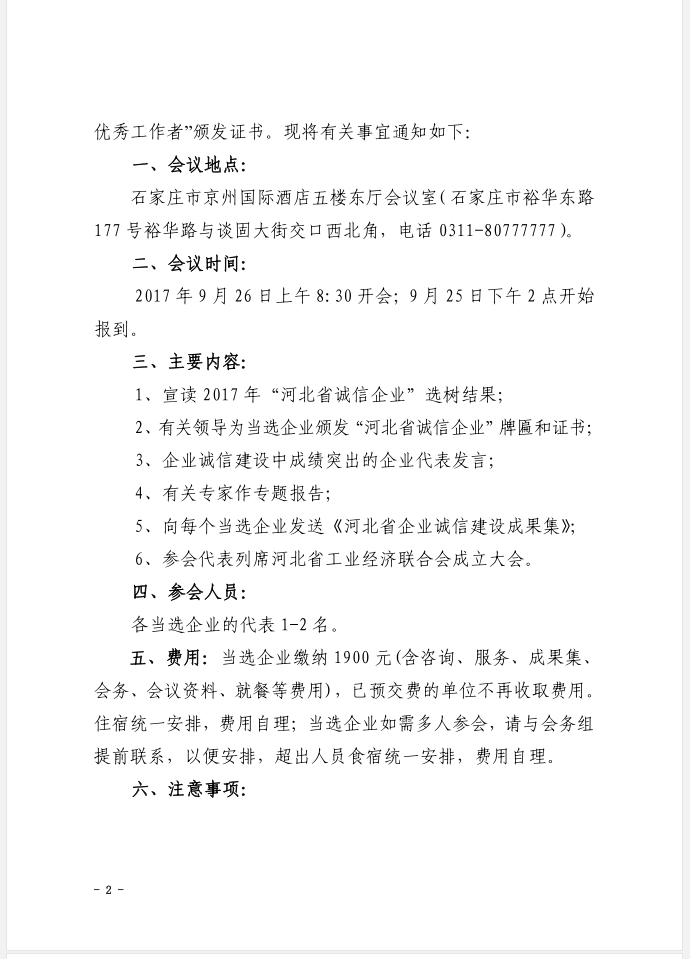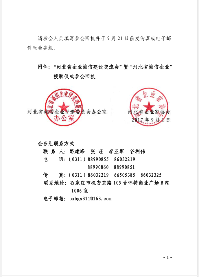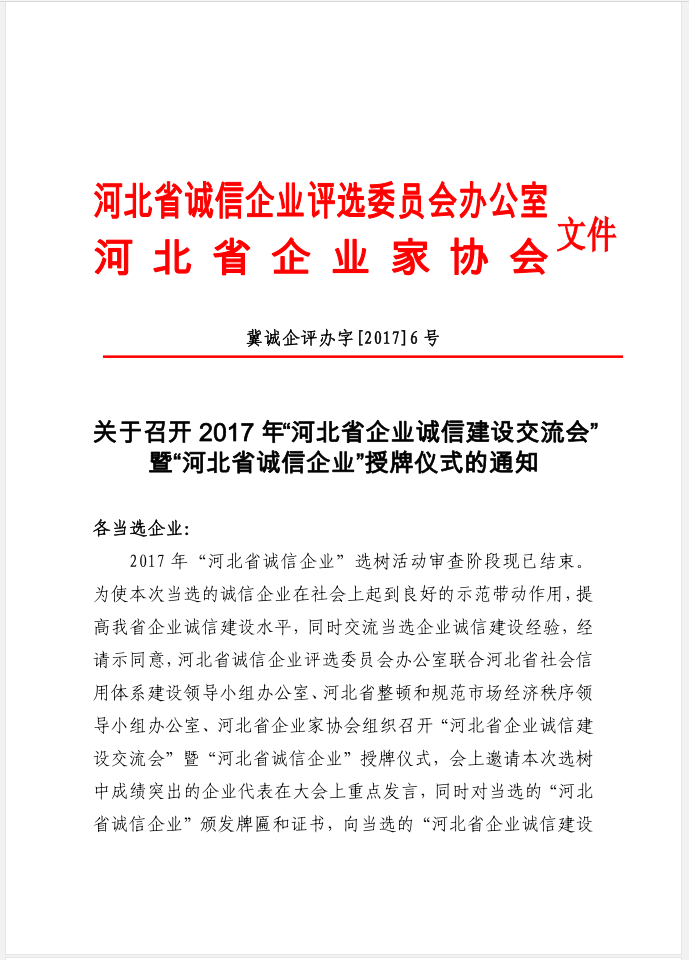 關(guān)于召開(kāi)2017年“河北省企業(yè)誠(chéng)信建設(shè)交流會(huì)”暨“河北省誠(chéng)信企業(yè)”授牌儀式的通知