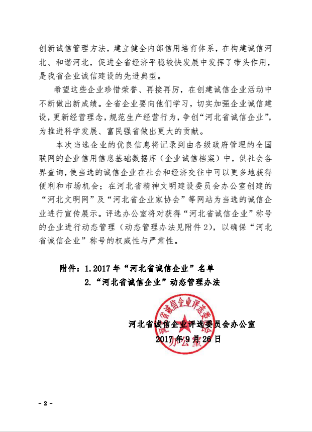 >關于命名 2017年“河北省誠信企業(yè)”的決定