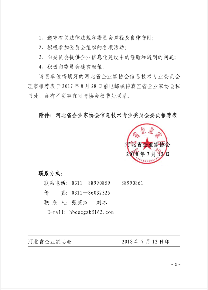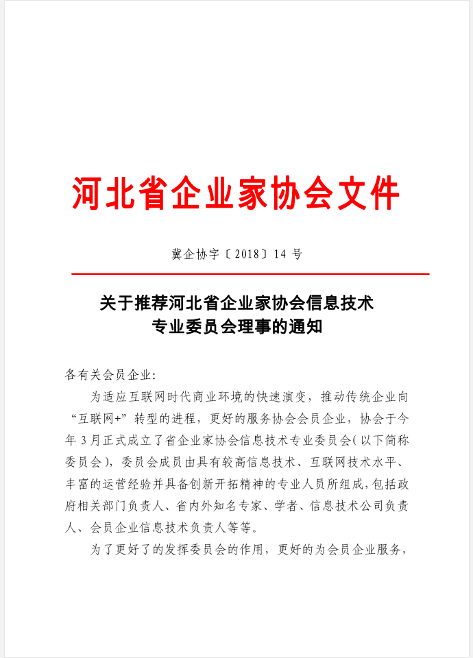 關(guān)于推薦河北省企業(yè)家協(xié)會(huì)信息技術(shù)專業(yè)委員會(huì)理事的通知