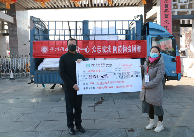 2月3日,龍臺(tái)酒業(yè)向隆化縣紅十字會(huì)捐款8萬元,定向購(gòu)買醫(yī)用消毒酒精,以解防控燃眉之急。