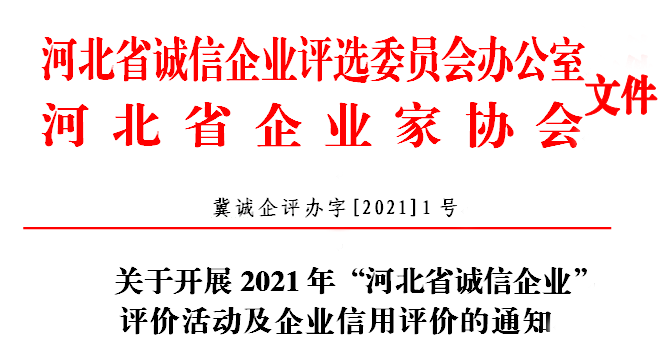 從2007年開始,經省有關領導批準,由省委、省政府有關部門和省級相關社團等單位參與開展的“河北省誠信企業(yè)”創(chuàng)建活動,對我省企業(yè)誠信建設起到了推動作用,得到省領導和社會各界的好評,產生了良好的社會影響。為深入貫徹落實黨中央、國務院及我省對誠信建設的精神,經研究決定,2021年繼續(xù)開展“河北省誠信企業(yè)”評價活動;同時引進第三方信用服務機構,為企業(yè)提供信用評價和信用報告,幫助企業(yè)在信用管理水平上進行提升;活動還將選樹一批“河北省企業(yè)誠信建設優(yōu)秀工作者”。現將活動有關事宜通知如下: