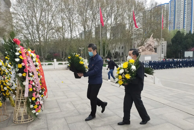 協(xié)會黨支部書記劉建軍(前),原書記張祥林為烈士紀念碑敬獻花籃。