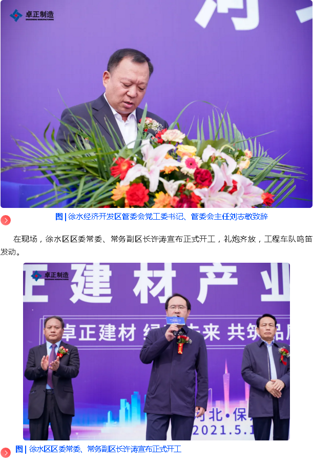 協(xié)會(huì)副會(huì)長(zhǎng)單位卓正控股集團(tuán)旗下河北卓正建材產(chǎn)品園,5月17日在保定徐水區(qū)大王店舉行開工儀式。
