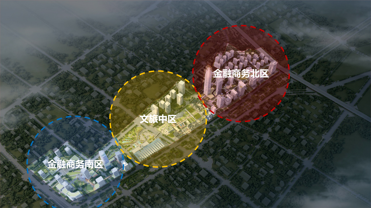 中央商務(wù)區(qū)自南向北整體規(guī)劃為金融商務(wù)北區(qū)、文旅中區(qū)、金融商務(wù)南區(qū)三大功能區(qū),率先開(kāi)發(fā)的是金融商務(wù)北區(qū)。