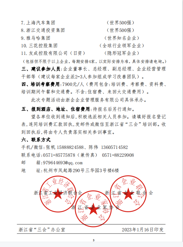 為深入貫徹落實(shí)黨的二十大精神,引導(dǎo)廣大企業(yè)進(jìn)一步完善企業(yè)管理系統(tǒng),增強(qiáng)企業(yè)管理能力,打造高素質(zhì)企業(yè)管理團(tuán)隊(duì),扎實(shí)推進(jìn)企業(yè)高質(zhì)量發(fā)展的目標(biāo)。浙江省企業(yè)聯(lián)合會(huì)、企業(yè)家協(xié)會(huì)組織舉辦《走進(jìn)長(zhǎng)三角——對(duì)標(biāo)世界一流企業(yè)研修班》(詳情請(qǐng)見(jiàn)所附文件),以對(duì)標(biāo)世界一流企業(yè)為抓手,引領(lǐng)帶動(dòng)各地企業(yè)共同發(fā)展。