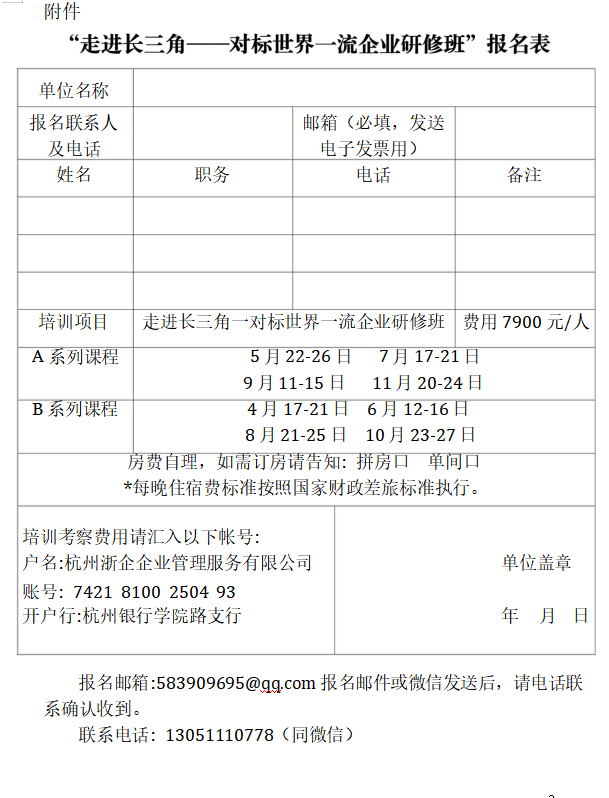 附件:“走進(jìn)長(zhǎng)三角一對(duì)標(biāo)世界一流企業(yè)研修班”報(bào)名表