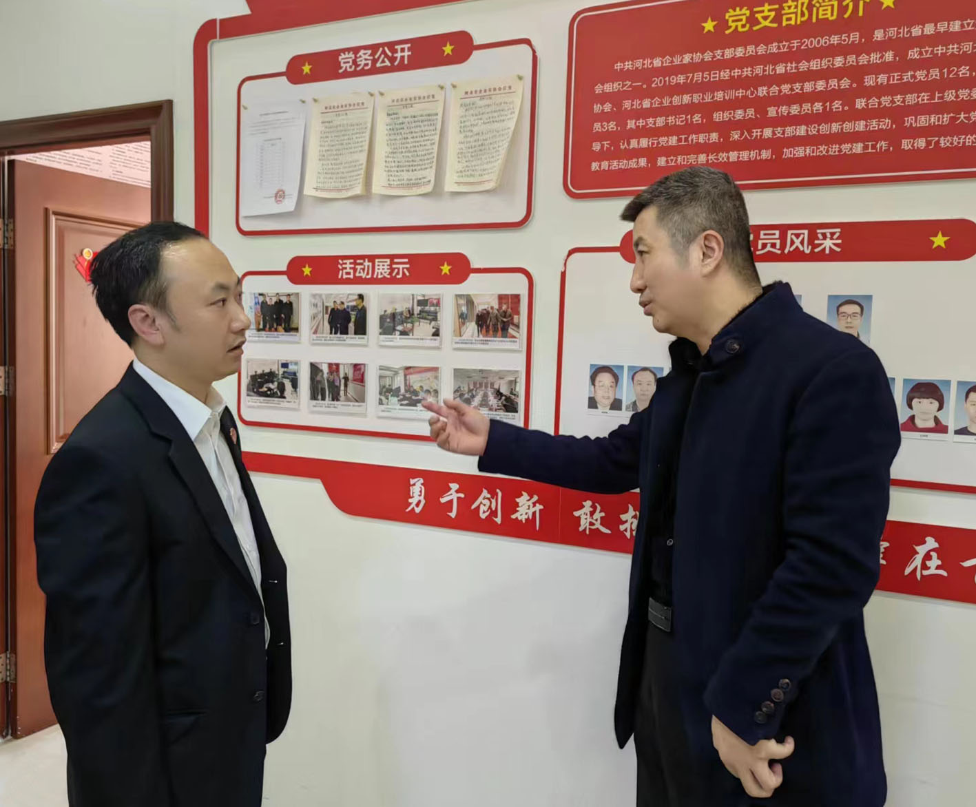 劉建軍秘書(shū)長(zhǎng)(右)為李智華秘書(shū)長(zhǎng)介紹協(xié)會(huì)公告欄